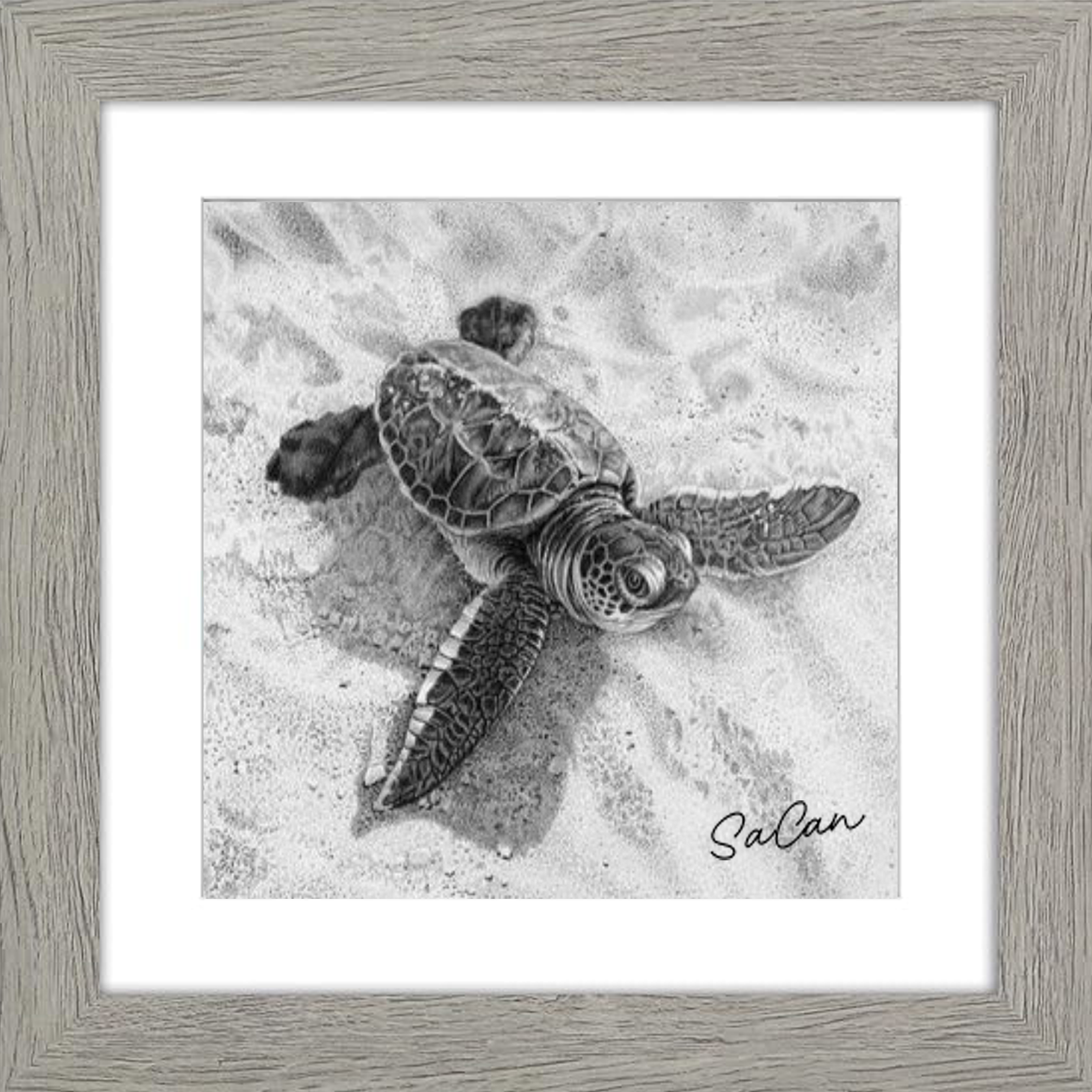 The image displays a framed black and white artwork depicting a baby sea turtle on sand, presented in a light gray wooden frame with a white mat border that elegantly highlights the monochromatic image.